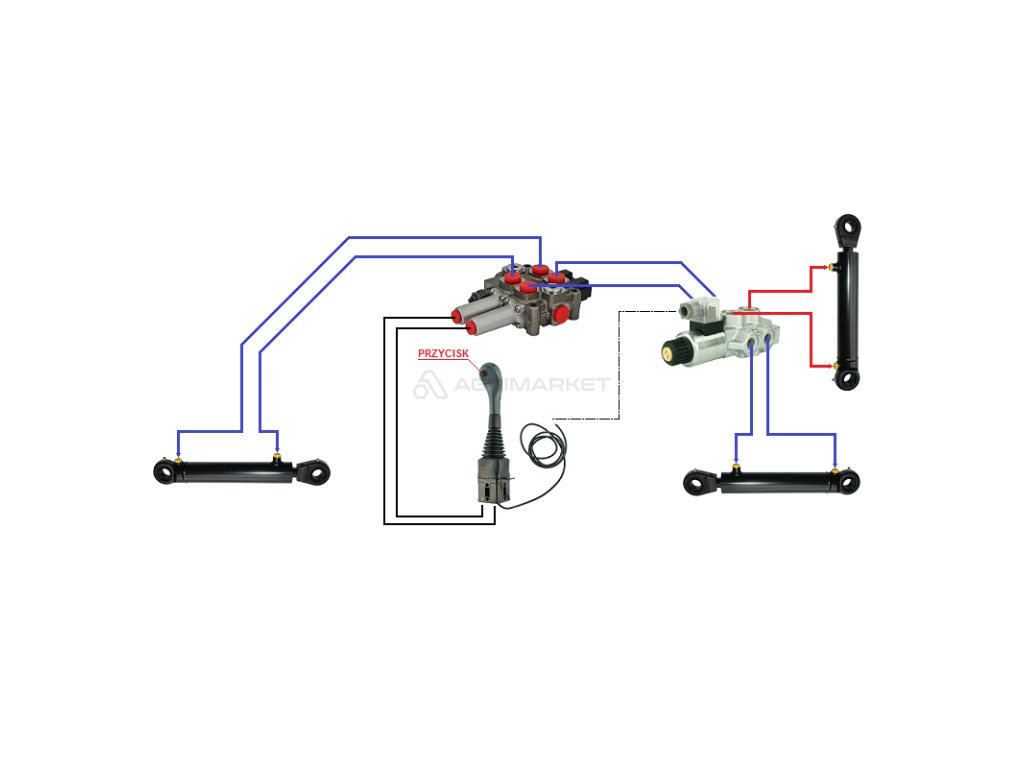 Solenoidový ventil je připojen k jedné ze dvou sekcí v rozdělovači, čímž se zdvojnásobuje. Elektricky ovládaný 2polohový jezdec přepíná tok oleje z rozdělovače mezi dva akční členy. V nakladači to mohou být válce pro vyrovnávání (naklápění) a drapákové nebo krokodýlí válce. V praxi pohyb joysticku bez stisknutého tlačítka ovládá aktor ze sklonu a po stisknutí tlačítka se ovládání přepne na zavírání a otevírání chapadla nebo krokodýla. |