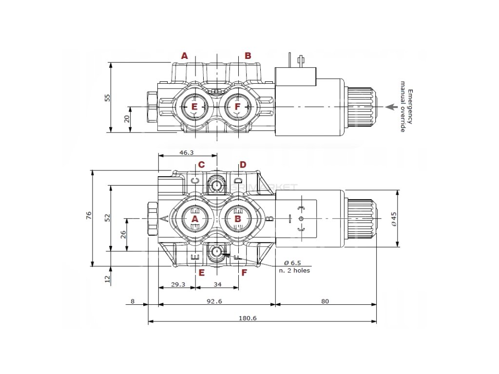 2-polohový jezdec na pružině, tj. po odpojení napájení cívky se vrací do neutrální polohy.