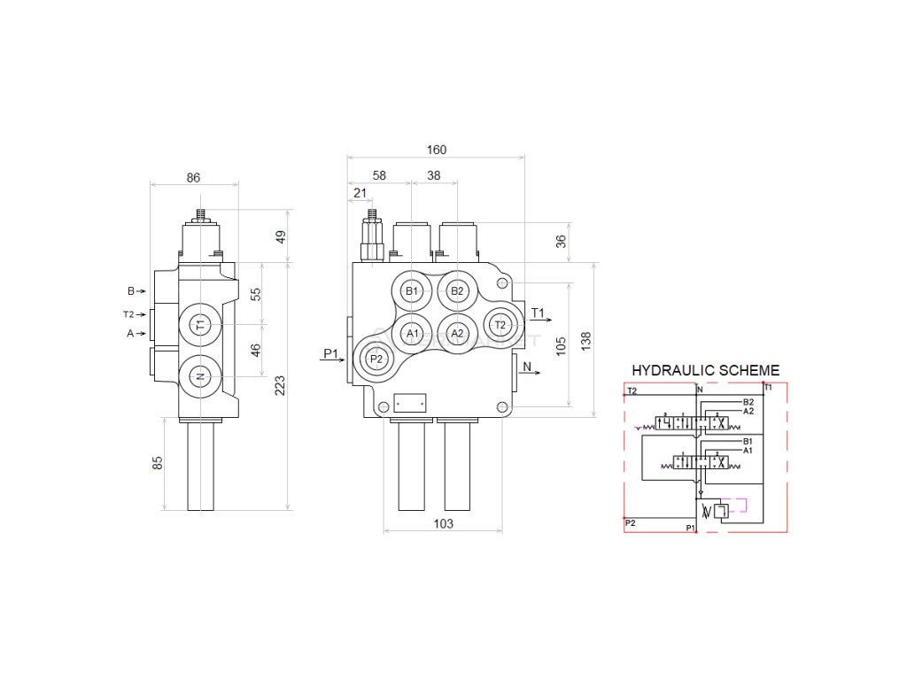 3sekce hydraulick sada: 80L rozvaděč s plovoucí sekce + 6/2 elektromagnetickě ventil + joystick s jedním tlačítkem + dva 1,5m kabely