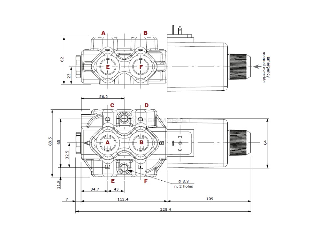 2-polohový jezdec na pružině, tj. po odpojení napájení cívky se vrací do neutrální polohy.