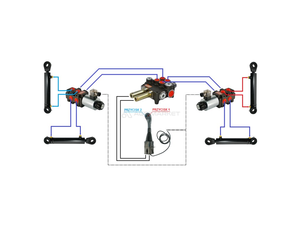 4sekce hydraulick sada: 80L rozvaděč + dva 6/2 elektromagnetick‚ ventily + joystick se dvěma tlačítky + dva 2,5m kabely