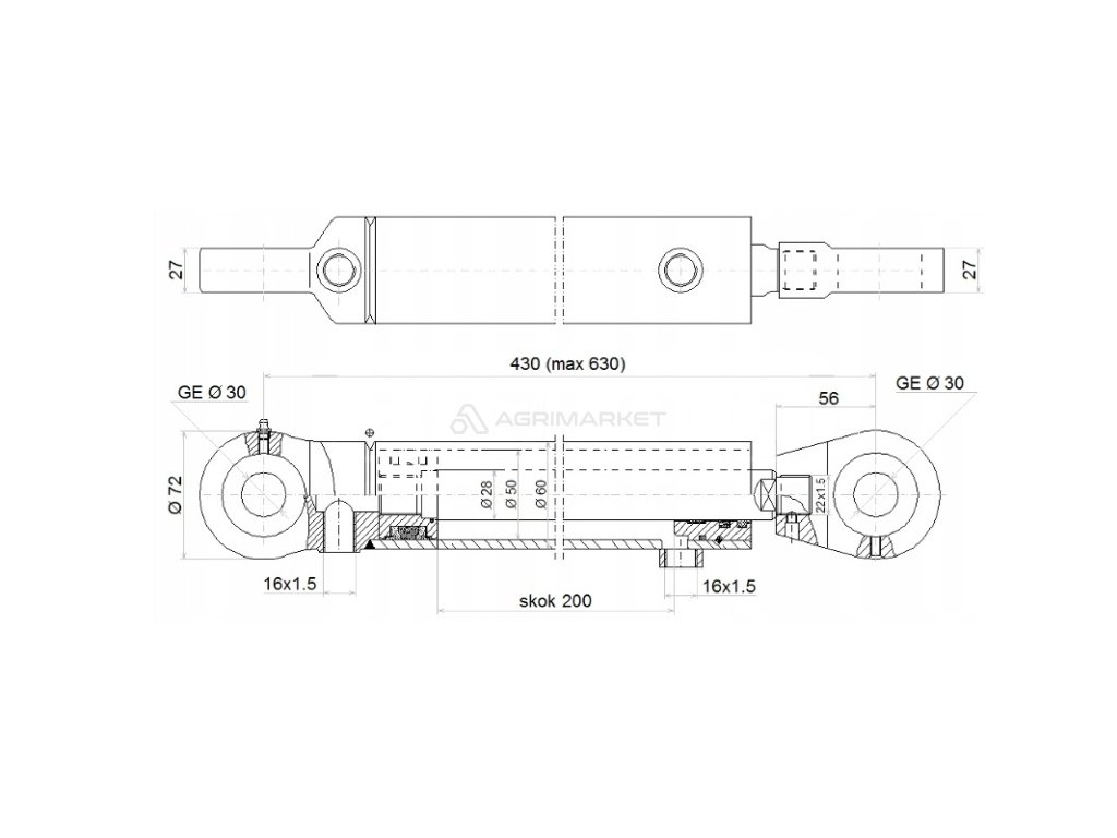 Dvojčinný hydraulický válec, délka: 430 mm, zdvih: 200 mm, CJ2F-50/28/200 U30 bison v sadě s omezovačem zdvihu
