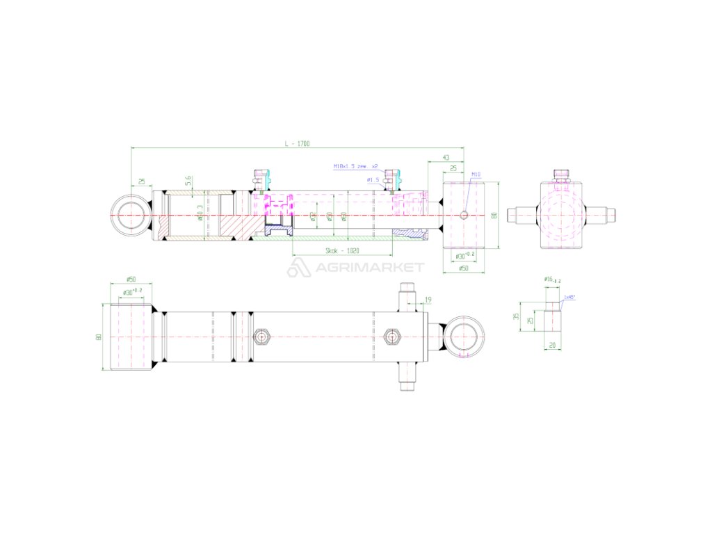 Dvojčinný hydraulický válec délka: 1700 mm zdvih: 1020mm CJ2F-50/32/1020