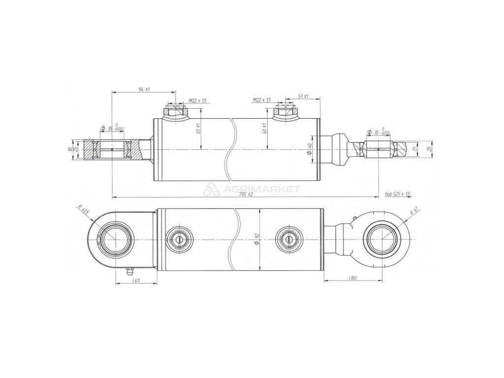Dvojčinný hydraulický válec délka: 795 mm zdvih: 525 mm CJ2F-80/40/525