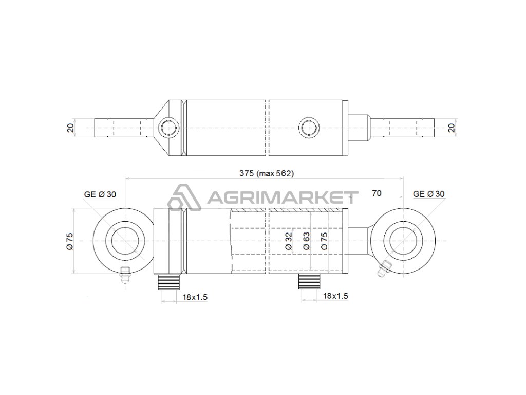 Dvojčinný hydraulický válec pro TUZ délka: 375 mm zdvih: 187 mm CJ2F-63/32/187