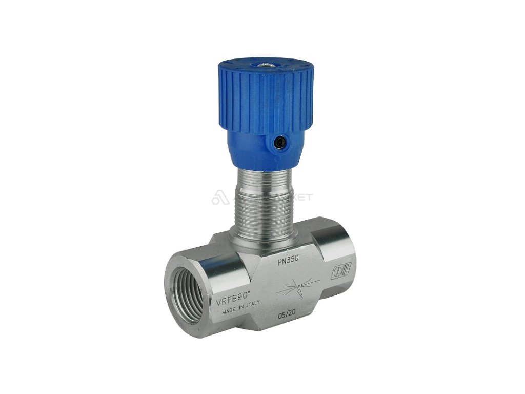 Dvoucestný hydraulický škrticí ventil VRFB 90 1" s přesnou regulací. Průtok: 110 l/min, max. tlak: 250 bar