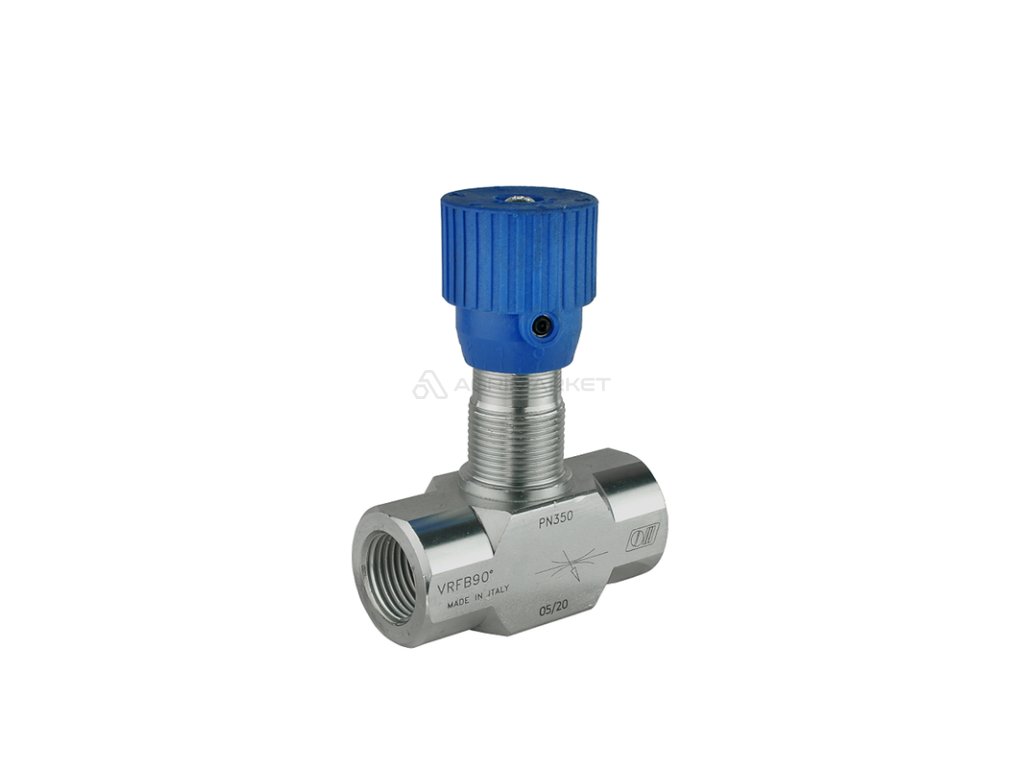 Dvoucestný hydraulický škrticí ventil VRFB 90 3/8" s přesnou regulací. Průtok: 30 l/min, max. tlak: 350 bar