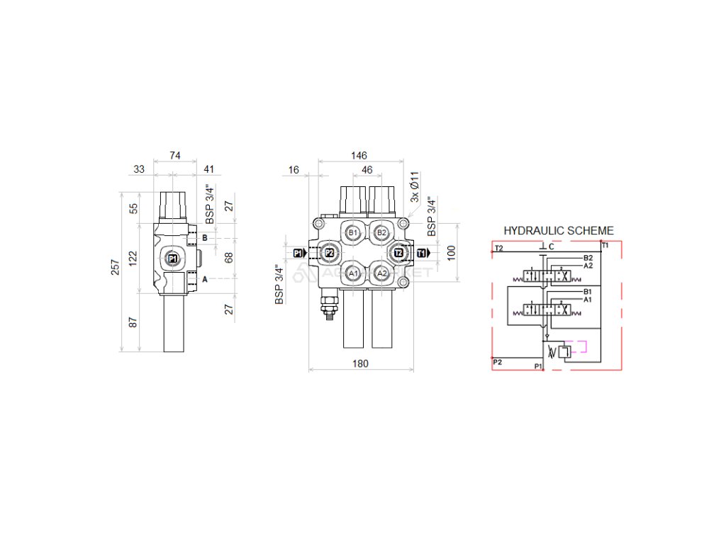 Hydraulick sada 3sekce joystick 1 tlačítko + 2x 3m kabely + 2s rozvaděč 120l + 6/2 elektromagnetickě ventil pro třetí sekce (drap k, krokoděl)