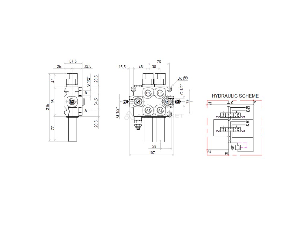 Hydraulick sada 4sekce Joystick 2 tlačítka + 2x 1m kabel + 2sek. rozvaděč 60l + 2x Solenoidově ventil 6/2 Pro 3 a 4 sekce (drap k, krokoděl)