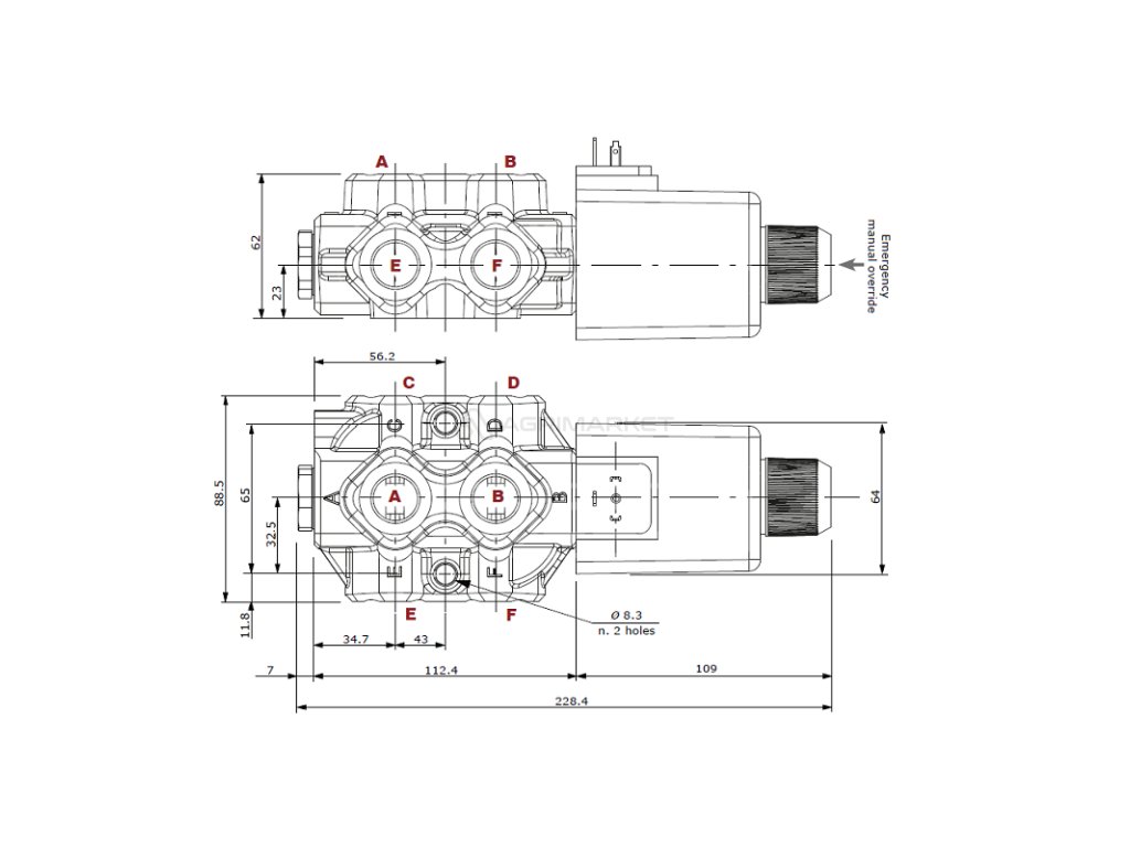 Hydraulick sada 4sekce joystick 2 tlačítka + 2x kabel 2,5m + 2-sek. rozvaděč 90l (1x plovoucí) + 2x elektromagnetickě ventil 6/2 pro 3 a 4 sekce (drap k, krokoděl)