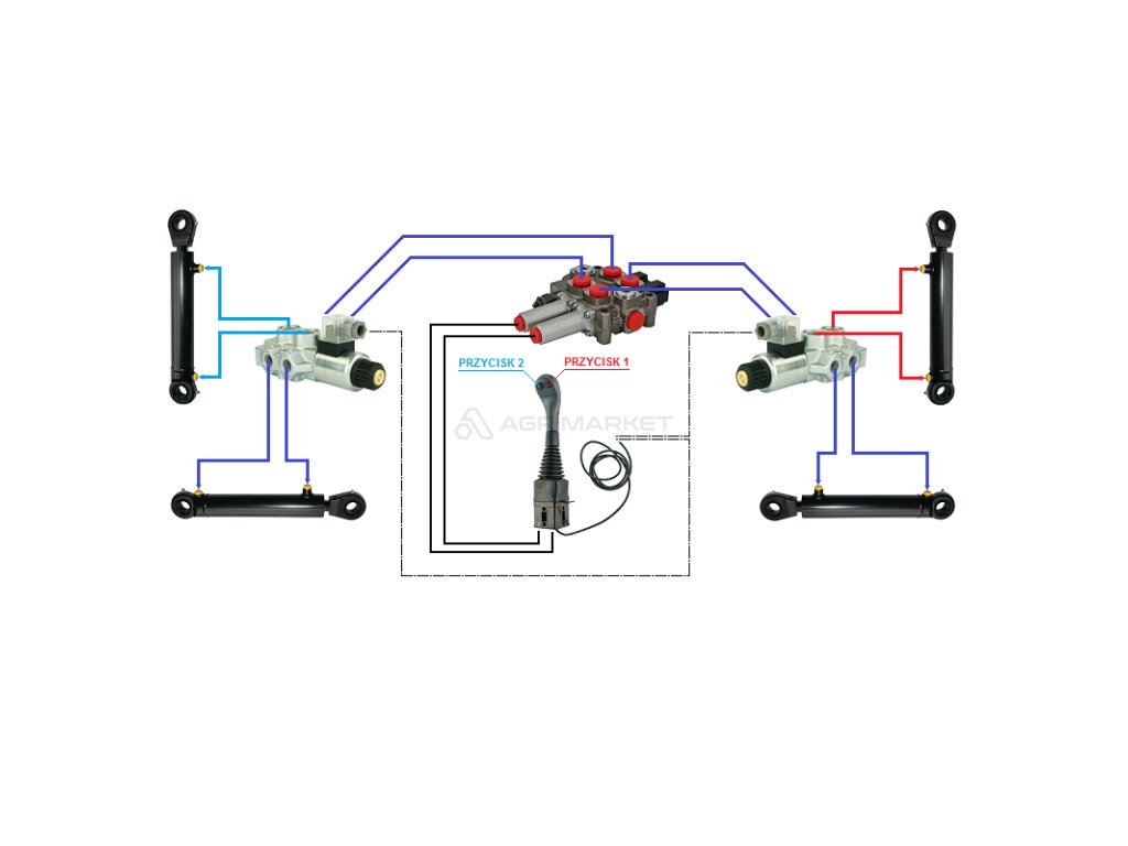 Hydraulick sada 4sekce joystick 2 tlačítka + 2x 2,5m kabel + 2sekce60l splitter (1x plovoucí) + 2x Solenoidově ventil 6/2 Pro 3 a 4 sekce (Drap k, Krokoděl)