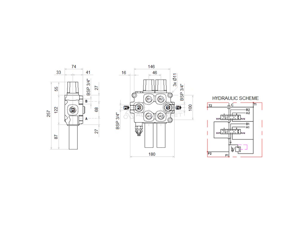 Hydraulick sada 4sekce joystick 2 tlačítka + 2x 3m kabely + 2sek. rozvaděč 120l + 2x elektromagnetickě ventil 6/2 pro 3 a 4 sekce (drap k, krokoděl)