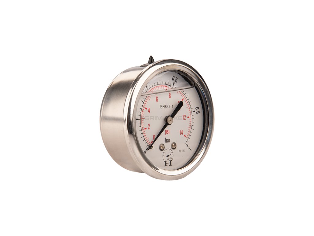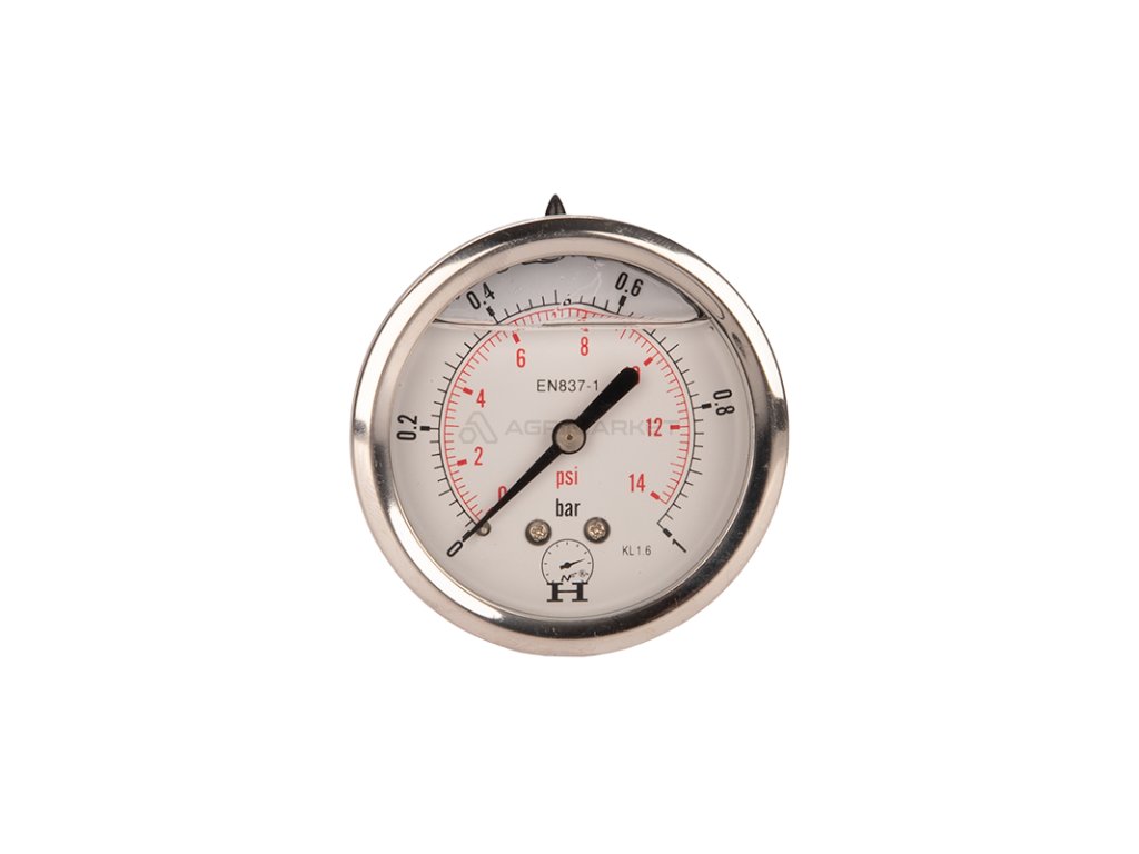 | Aplikace: | Je široce používán v hydraulických systémech ve stavebnictví, zemědělství a průmyslu. Manometr určený k měření tlaku kapaliny v uzavřených systémech. Měření tlaku neregulačních plynů a kapalin se slitinami mědi. Tlakoměr je uvnitř naplněn glycerinem, takže měření je přesné i přes otřesy a vibrace. Má zátku pro vyrovnání tlaku uvnitř manometru s atmosférickým tlakem. |