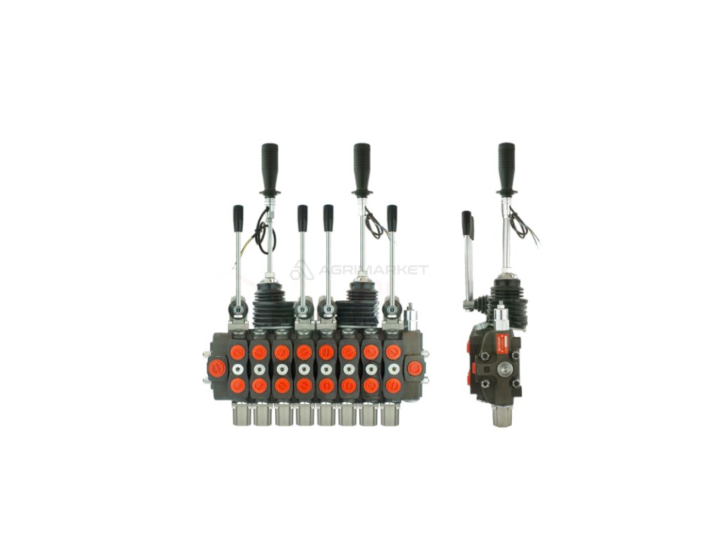 ![]() | Práce a princip činnosti: Hydraulický rozdělovač s otevřeným diagramem, pokud není ovládán žádný úsek, olej volně proudí přes rozdělovač do zpětného kanálu (T). Všechny páky a joysticky jsou namontovány na pružině a automaticky se vracejí do střední polohy. Všechny sekce jsou přizpůsobeny k ovládání obousměrných nebo jednosměrných hydraulických válců a motorů v jednom nebo dvou směrech. |