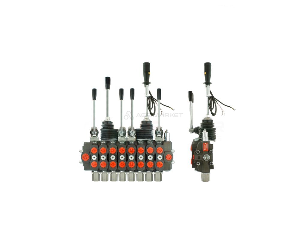 ![]() | Práce a princip činnosti: Hydraulický rozdělovač s otevřeným diagramem, pokud není ovládán žádný úsek, olej volně proudí přes rozdělovač do zpětného kanálu (T). Všechny páky a joysticky jsou namontovány na pružině a automaticky se vracejí do střední polohy. Všechny sekce jsou přizpůsobeny k ovládání obousměrných nebo jednosměrných hydraulických válců a motorů v jednom nebo dvou směrech. |