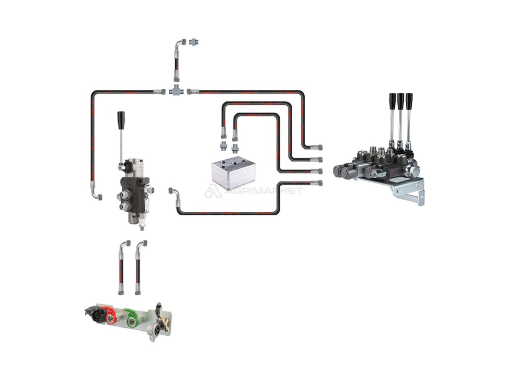 | Hydraulické hadice a upevňovací prvky: | Sada obsahuje všechny potřebné hydraulické hadice a konektory potřebné pro připojení a správnou funkci nových rozvaděčů, zadního táhla a zadních objímek. |