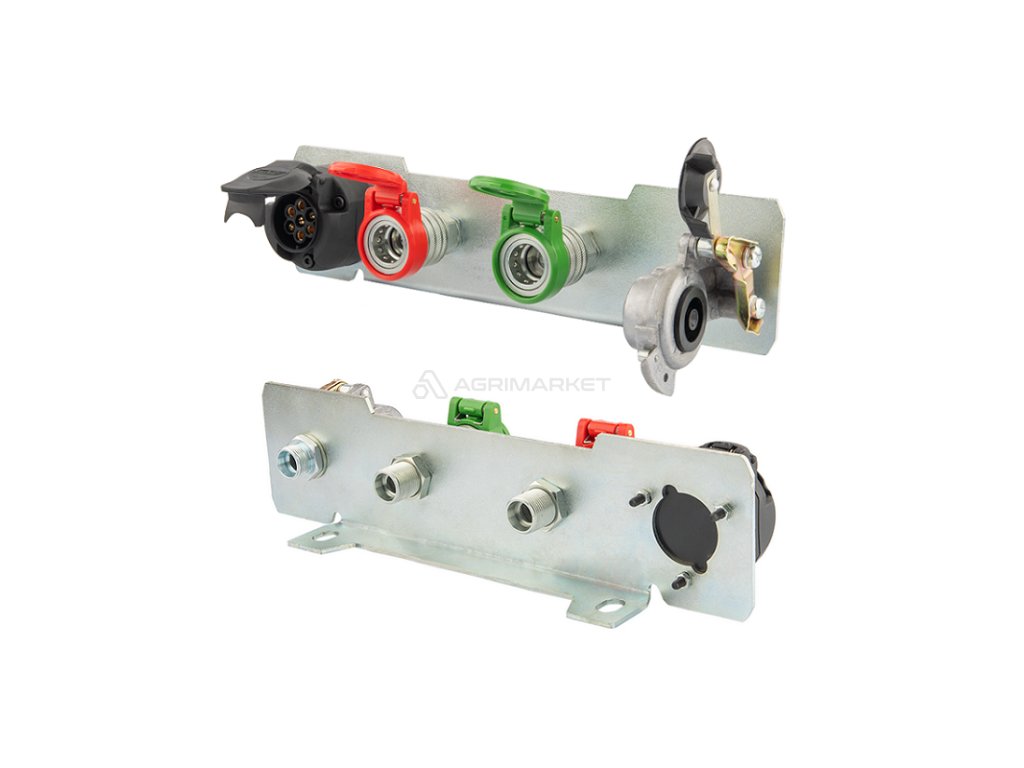 | Pole zadních zásuvek: | Deska je vybavena typickou 7-pinovou elektrickou zásuvkou, dvěma rychlospojkami, EURO zásuvkami, plastovými samouzavíracími prachovkami a standardizovaným, pohyblivým, měkkým vzduchovým konektorem pro pneumatický brzdový systém. Desku je doporučeno montovat ve svislé poloze na stejnou stranu jako rozdělovač. |