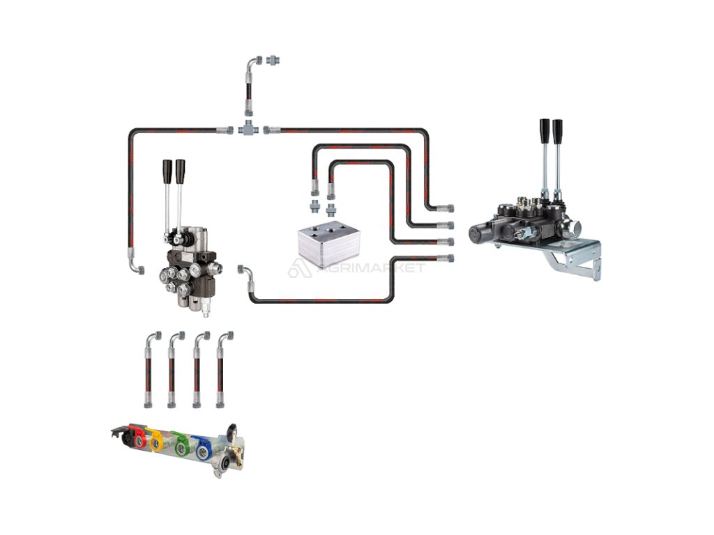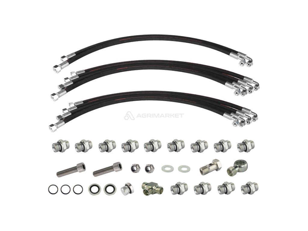 | Hydraulické hadice a upevňovací prvky: | Sada obsahuje všechny potřebné hydraulické hadice a konektory potřebné pro připojení a správnou funkci nových rozvaděčů, zadního táhla a zadních objímek. |
