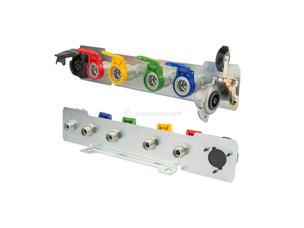 | Pole zadních zásuvek: | Deska je vybavena typickou 7-pinovou elektrickou zásuvkou, čtyřmi rychlospojkami, EURO zásuvkami, plastovými samouzavíracími prachovkami a standardizovaným, pohyblivým, měkkým vzduchovým konektorem pro pneumatický brzdový systém. Desku je doporučeno montovat ve svislé poloze na stejnou stranu jako rozdělovač. |
