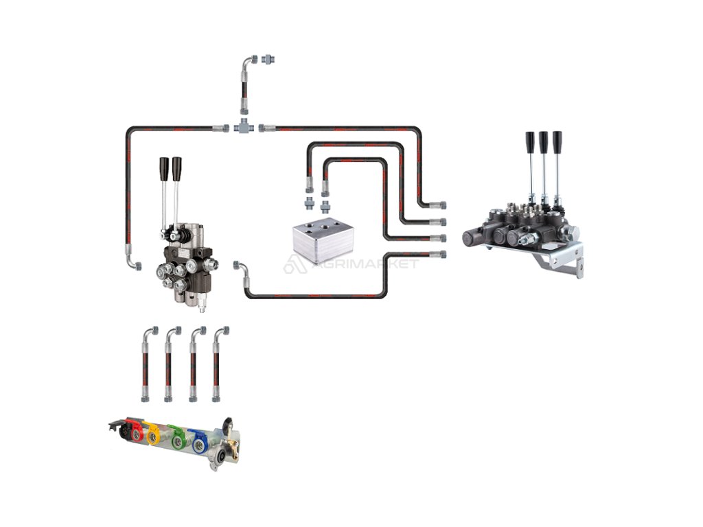 | Hydraulické hadice a upevňovací prvky: | Sada obsahuje všechny potřebné hydraulické hadice a konektory potřebné pro připojení a správnou funkci nových rozvaděčů, zadního táhla a zadních objímek. |
