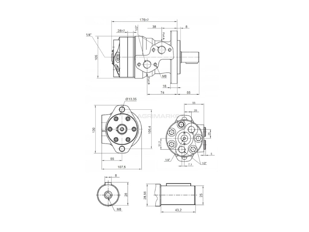 Hydromotor MRE, absorpce: 160 cm3/ot, otáčky: 375 ot./min., hřídel: 25mm
