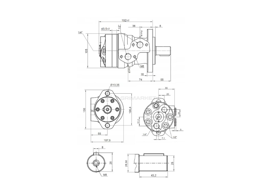 Hydromotor MRE, absorpce: 250 cm3/ot, otáčky: 240 ot./min., hřídel: 25mm