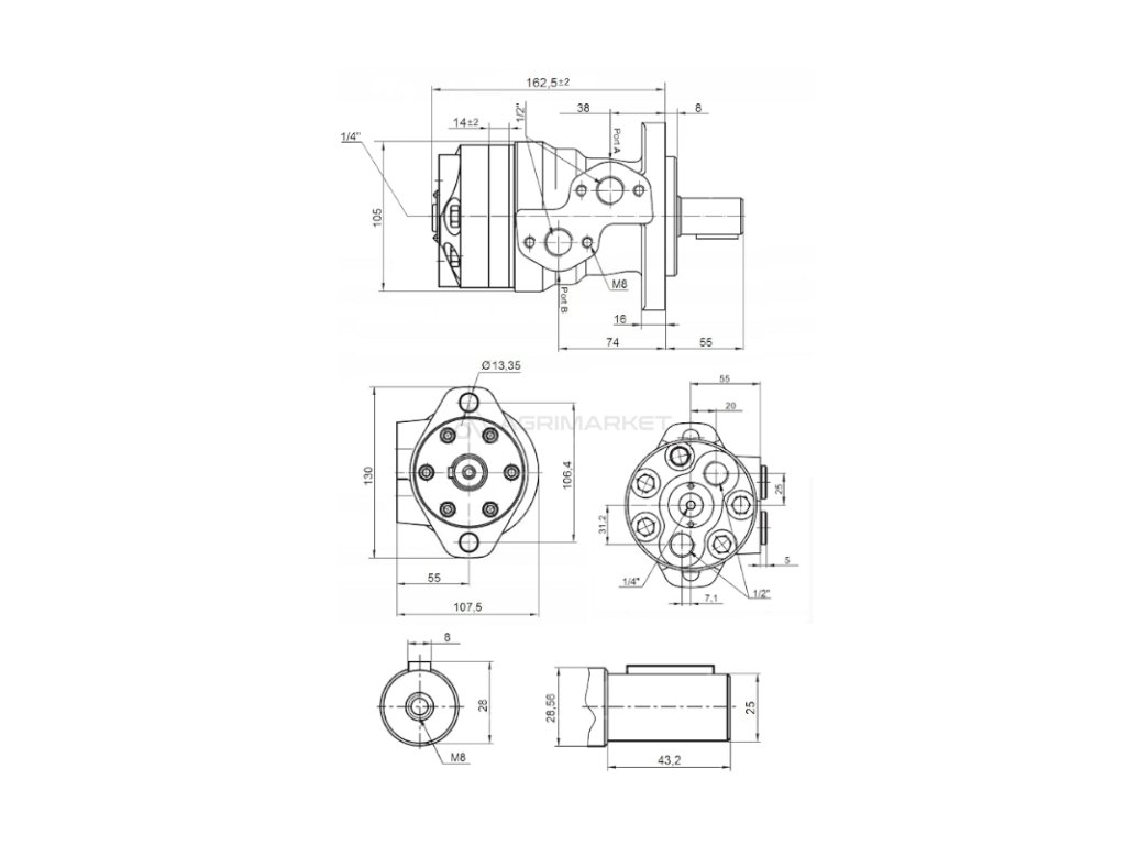 Hydromotor MRE, absorpce: 80 cm3/ot, otáčky: 750 ot./min., hřídel: 25 mm