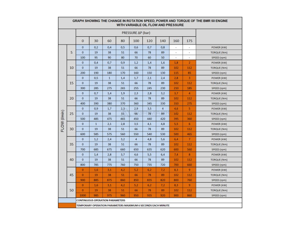 | Aplikace: | Je široce používán v hydraulických systémech v zemědělství, stavebnictví a průmyslu. Motory se stejnými rozměry, v závislosti na původu a výrobci, se objevují pod různými symboly, včetně: SMR, BMP, OMP, EMP a dalších. Hydromotor BMR 50 je určen především pro použití v různých typech zemědělské a průmyslové techniky. V systémech s průměrnou spotřebou energie a průměrným průtokem oleje chceme dosáhnout poměrně vysokých otáček.