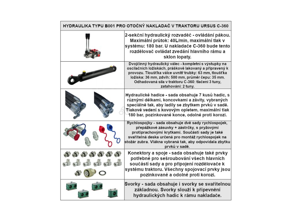 Kompletní hydraulika pro nakladač Tur C-360 C-360-3P, rozdělovač + válec hlavy + kabely + komponenty