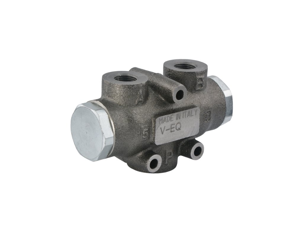 ![]() | Princip činnosti: Ventil konstantní rozděluje průtok oleje na dva stejné průtoky 50/50. Udržuje stejný průtok na obě hydraulická potrubí bez ohledu na jejich zatížení. Připojení: Připojte P k napájecímu zdroji, připojte A a B k přijímačům. |