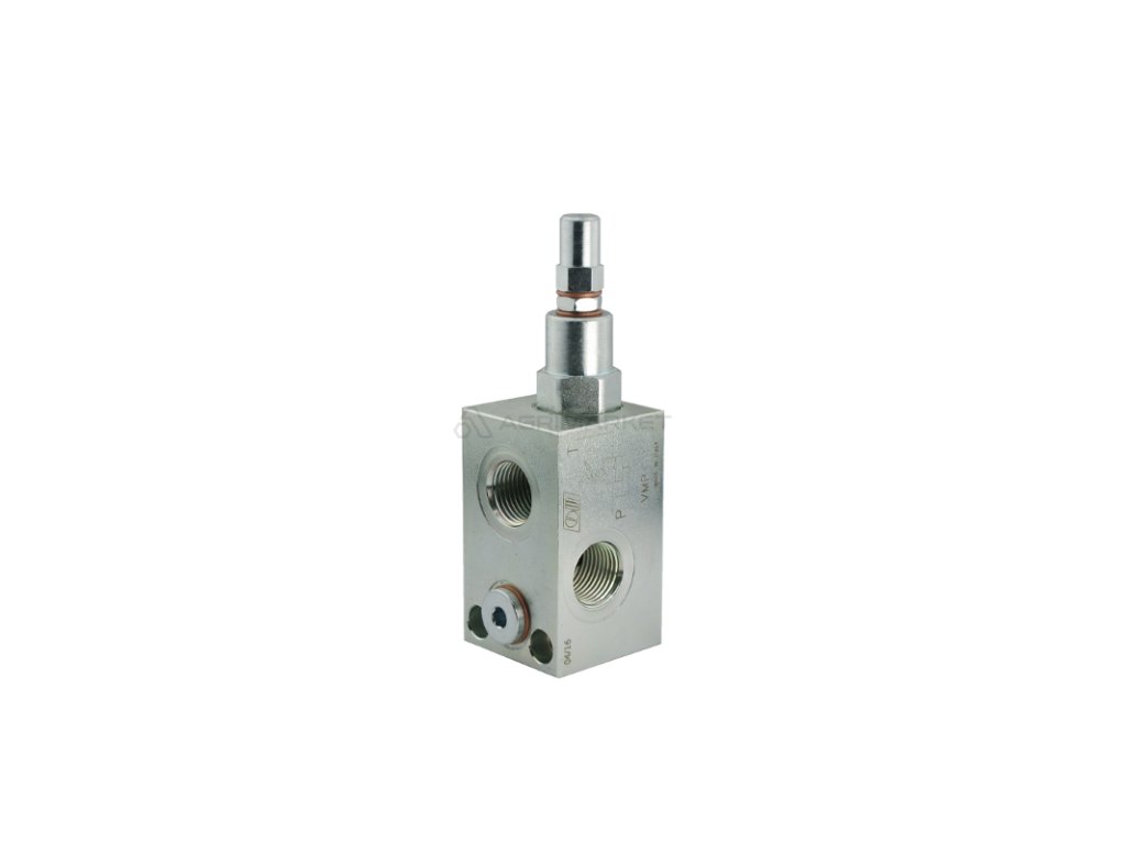 ![]() | Princip činnosti: Přepouštěcí (bezpečnostní) ventil omezuje maximální tlak v systému. Plní typicky bezpečnostní funkci při náhlém přetížení systému. Možnost volné regulace tlaku otevření. Má port pro připojení manometru. Připojení: Připojte P k přívodnímu potrubí a T k nádrži. |