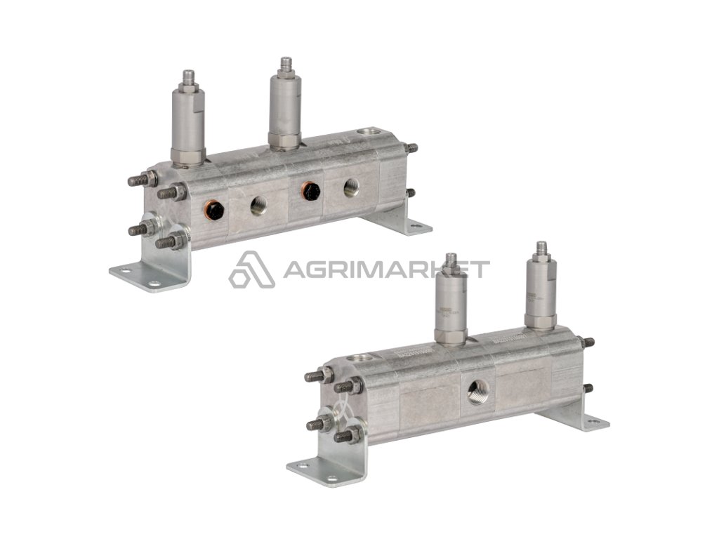 Přesný ozubený dělič průtoku oleje GR10 2x6,3cm3 1xIN - 2xOUT s vyrovnávacími ventily. Rozsah vstupního průtoku oleje: 15,2 - 37,5L/min.