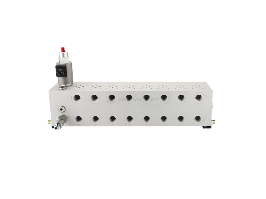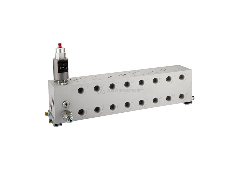 | Aplikace: | Je široce používán v hydraulických systémech ve stavebnictví, zemědělství a průmyslu. Připojovací desky nebo ventilové bloky jsou součástí kompletních hydraulických rozvaděčů CETOP. Slouží jako základ pro přišroubování šoupátkových rozdělovačů CETOP 3 NG6. Kluzné rozdělovače pro deskovou instalaci se používají k ovládání směru toku oleje, což vede ke specifickému pohybu nebo zastavení přijímače, např. pohonu nebo hydraulického motoru. Deska umožňuje instalaci osmi šoupátek z řady CETOP 3 NG6. |