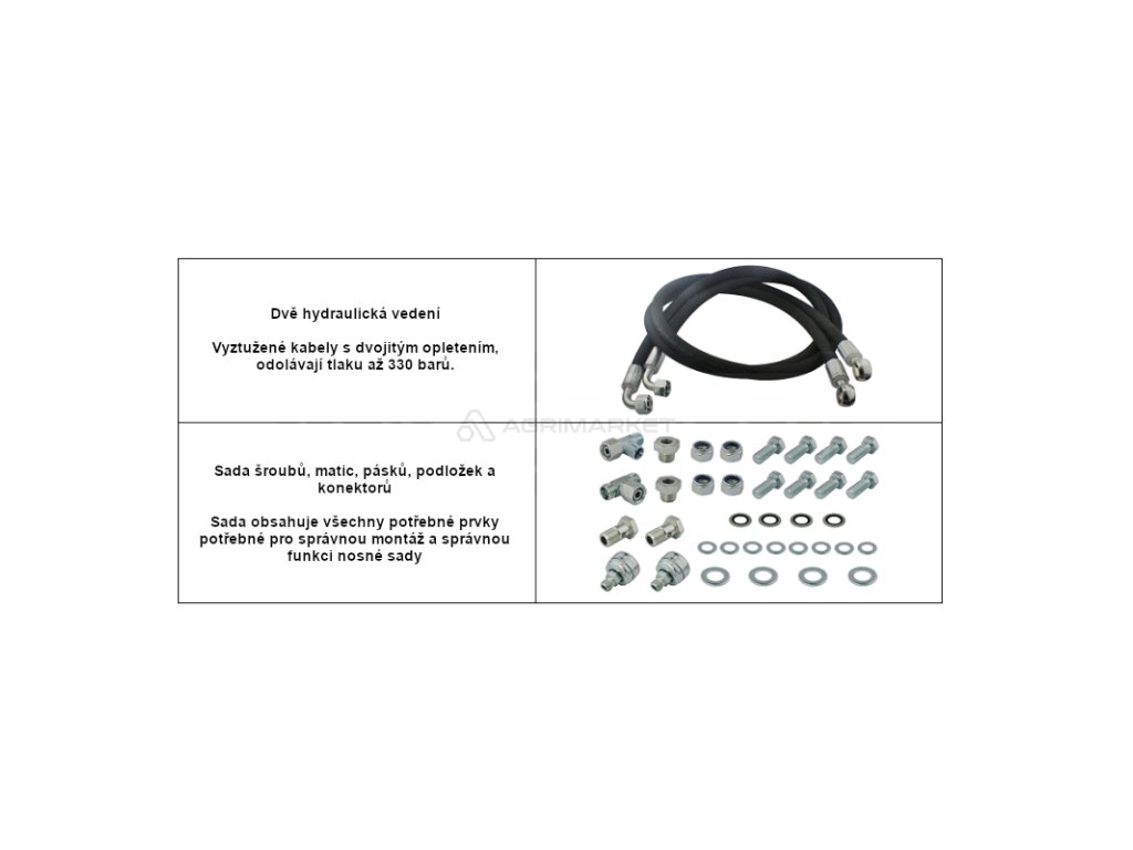 | Technická data: | Náš set se vyznačuje nejvyšší kvalitou mezi dostupnými na trhu. Použili jsme hadice, které vydrží tlak až 330Bar, takže se při jízdě těžkého stroje po nerovném povrchu nezlomí. Spodní čepy jsou vyrobeny z kalené oceli, horní páky jsou vyrobeny z kalené tvárné litiny a čepy mají zvýšenou pevnostní třídu 8.8. Vybrané vysoce kvalitní materiály a preciznost zpracování zajišťují dlouhý bezporuchový provoz. Sada pro podporu 3bodového systému odpružení obsahuje všechny potřebné prvky pro instalaci a správnou funkci v traktoru. |