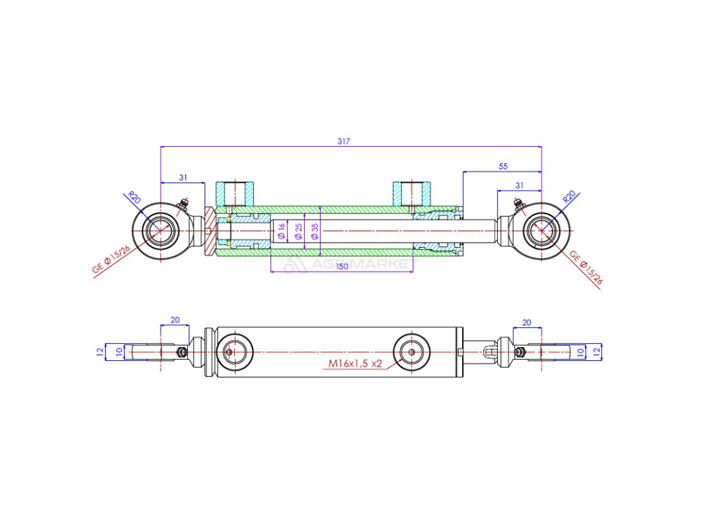 Válec dvojčinný hydraulický válec s montážní délkou: 317mm zdvih: 150mm CJ2F-25/16/150 U15S