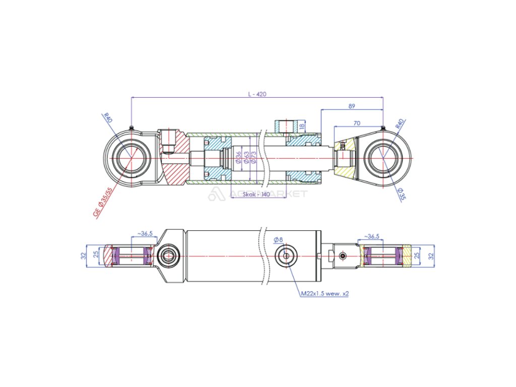 Válec dvoučinný hydraulický válec délka: 420 mm zdvih: 140 mm CJ2F-63/36/140 U35W