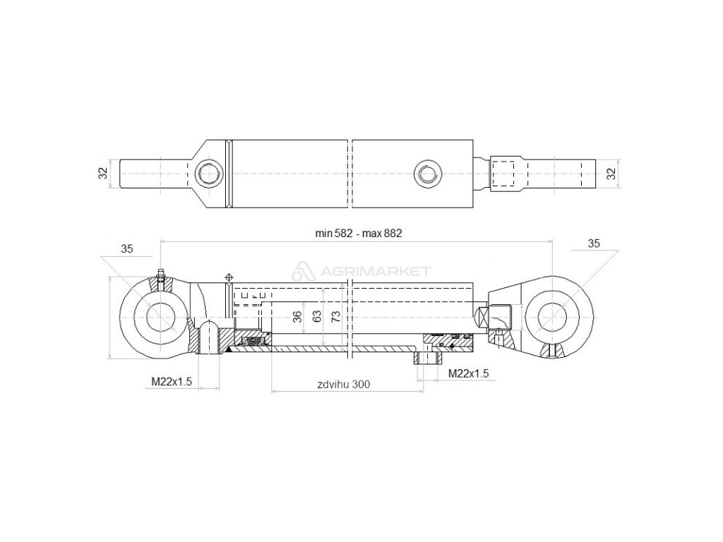 Válec dvoučinný hydraulický válec délka: 582 mm zdvih: 300 mm CJ2F-63/36/300 U35W