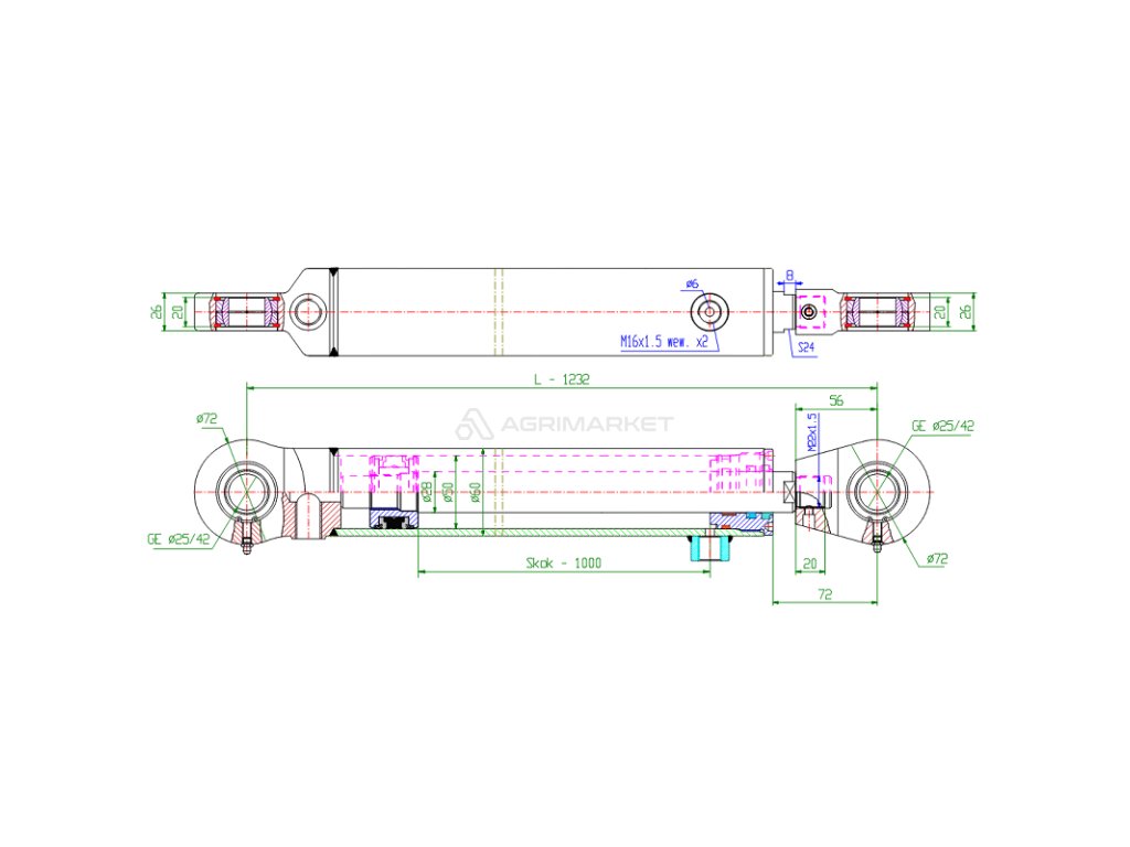 Válec hydraulický válec píst dvojčinný délka: 1232 mm zdvih: 1000 mm CJ2F-50/28/1000B U25W